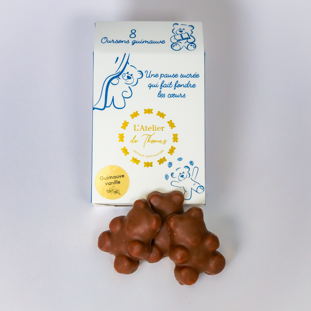 Oursons guimauve à la vanille de Madagascar enrobés de chocolat au lait 40% ou chocolat noir 66%